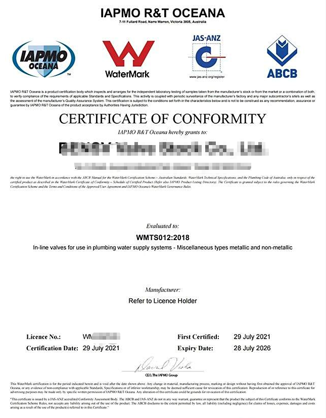 Watermark认证是澳大利亚标准局(Standards Australia Limited)的认证标志。Watermark 是由独立认证机构所提供的产品质量认证,它确保产品符合澳洲相关的卫浴法规以及产品标准。根据澳洲的卫浴法规,所有在澳洲安装的卫浴产品需要强制进行此项认证。Watermark认证是卫浴产品在澳大利亚最权威的认证,做了该认证的产品在澳洲市场具有较强的竞争力,意味着更大程度地被消费者和规则制定者接受。通过了认证,说明你有能力持续地生产符合公认标准的产品,这样一来无形之中降低了此产品的责任风险。