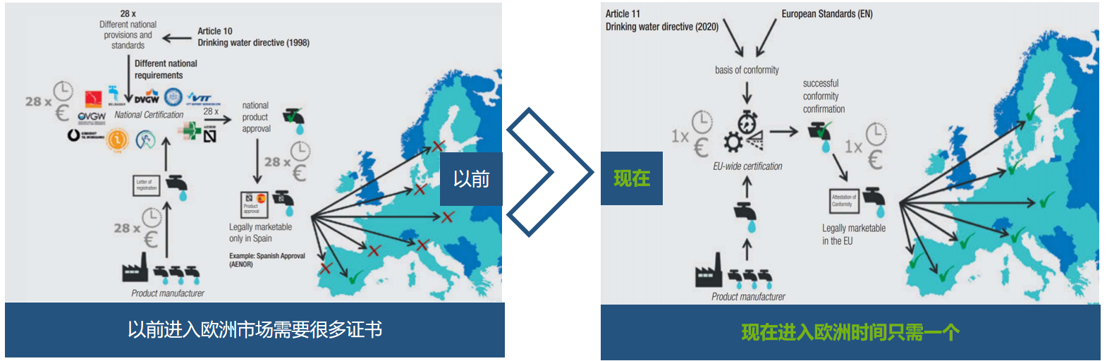 新的《欧盟饮用水指令》明确了一个工厂只需要做一个认证就可以进入所有的欧盟成员国,减少了厂家的时间和经济成本。