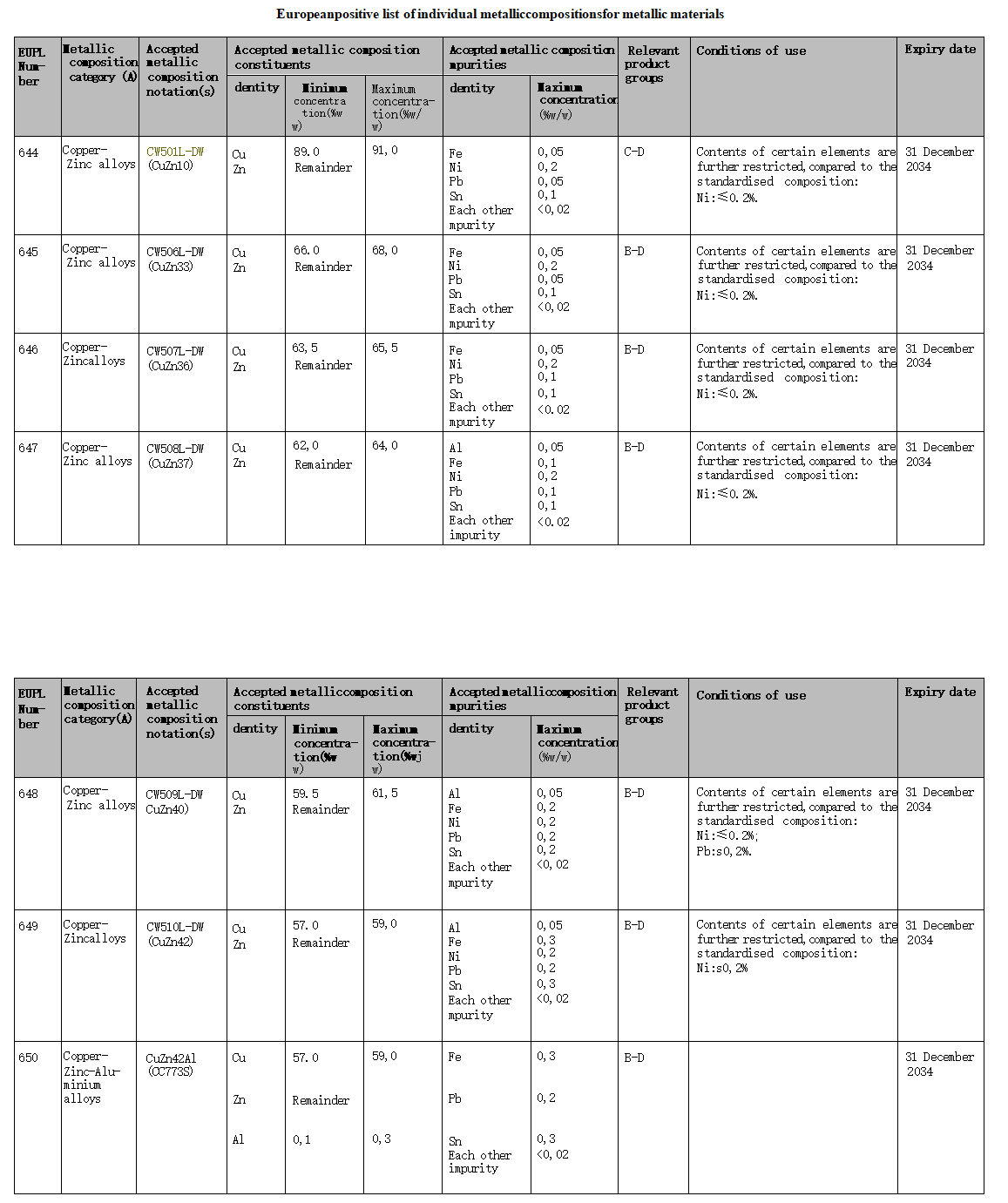 - 法国,意大利等国:在27年1月1号之前,用现行的CW617N,CW511L,CW757S等等铜材获得该国的国家证书,这样可以使用到证书有效期到期(5年)。或者是现在修改为新的铜牌号去申请欧盟饮用水证书(DWD);